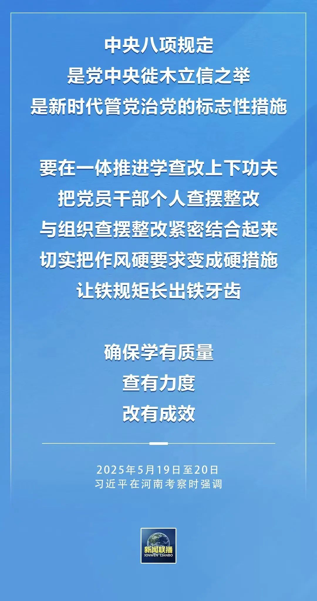 習(xí)近平總書記在河南考察時對深入貫徹中央八項規(guī)定精神學(xué)習(xí)教育提出明確要求,強(qiáng)調(diào)“要在一體推進(jìn)學(xué)查改上下功夫”“確保學(xué)有質(zhì)量、查有力度、改有成效”。