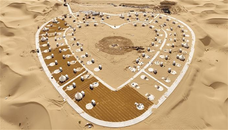項(xiàng)目占地面積約13.33公頃,總建筑面積15952㎡。建設(shè)內(nèi)容包括游客服務(wù)中心、休閑中心及230座帳篷設(shè)施等。設(shè)計(jì)以?xún)?yōu)美的異形建筑為中心,錯(cuò)落有致的帳篷環(huán)繞四周,如繁星點(diǎn)綴在沙漠中,形成一道優(yōu)美的風(fēng)景線。