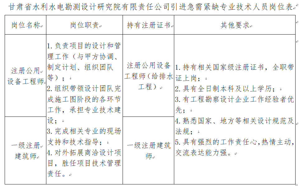 本次引進(jìn)的具體崗位及資格條件詳見《甘肅省水利水電勘測(cè)設(shè)計(jì)研究院有限責(zé)任公司引進(jìn)急需緊缺專業(yè)技術(shù)人員崗位表》(附件1)。