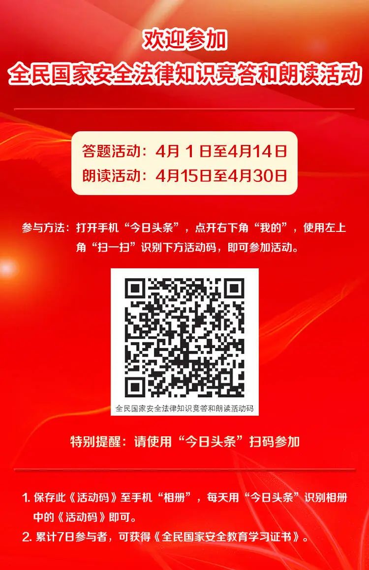 今年是國家安全法頒布施行10周年,4月15日是第十個全民國家安全教育日。為深入貫徹落實習(xí)近平總書記關(guān)于全面加強國家安全教育的重要指示批示精神,推進國家安全法治宣傳教育走深走實,增強全民國家安全意識和法治意識,倡議大家參加全民國家安全法律知識競答和朗讀活動。