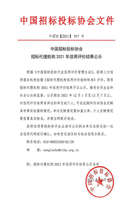 近日,在中國(guó)招標(biāo)投標(biāo)協(xié)會(huì)牽頭組織的2021年招標(biāo)代理機(jī)構(gòu)級(jí)信用評(píng)價(jià)認(rèn)證工作中,經(jīng)中招協(xié)委托的第三方信用服務(wù)機(jī)構(gòu)(國(guó)資委)商業(yè)信用中心及有關(guān)行業(yè)專家評(píng)審,招標(biāo)咨詢集團(tuán)子公司甘肅省招標(biāo)中心有限公司和甘肅金安建設(shè)工程項(xiàng)目管理有限公司獲得2021年招標(biāo)代理機(jī)構(gòu)AAA級(jí)信用評(píng)價(jià)最高等級(jí)認(rèn)證。