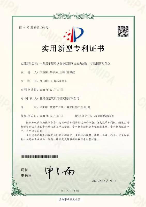 近日,從國(guó)家知識(shí)產(chǎn)權(quán)局傳來好消息,由建筑設(shè)計(jì)院總工程師張舉濤、設(shè)計(jì)四所總工程師江重陽(yáng)、設(shè)計(jì)五院總工程師王棟、設(shè)計(jì)四所工程師姚佩歆聯(lián)合申報(bào)的“一種用于矩形鋼管單層鋼網(wǎng)殼的內(nèi)部加十字肋圓筒形節(jié)點(diǎn)”技術(shù),喜獲國(guó)家實(shí)用新型專利。