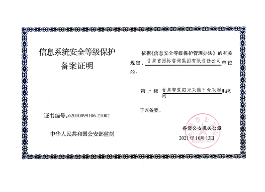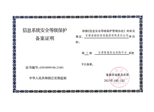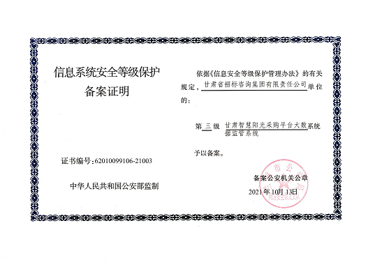甘肅智慧陽光采購平臺“六大系統(tǒng)”于2021年10月13日完成定級、備案,近期完成安全建設(shè)和整改、信息安全等級測評、信息安全檢查,順利通過國家三級等保認證,使平臺系統(tǒng)具有完善的防火墻、入侵檢測、數(shù)據(jù)加密以及災(zāi)難恢復(fù)等網(wǎng)絡(luò)安全設(shè)施和管理制度。