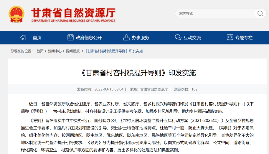 為進(jìn)一步貫徹落實(shí)中共中央辦公廳、國務(wù)院辦公廳《農(nóng)村人居環(huán)境整治提升五年行動方案(2021—2025年)》及全省鄉(xiāng)村規(guī)劃推進(jìn)會精神,由甘肅省城鄉(xiāng)規(guī)劃設(shè)計(jì)研究院有限公司牽頭,聯(lián)合甘肅省建筑設(shè)計(jì)研究院有限公司、西北師范大學(xué)城市規(guī)劃與旅游景觀設(shè)計(jì)研究院編制的《甘肅省村容村貌提升導(dǎo)則(試行)》(以下簡稱《導(dǎo)則》),于3月18日由省自然資源廳、省住建廳、省農(nóng)業(yè)農(nóng)村廳、省文旅廳、省鄉(xiāng)村振興局等五部門聯(lián)合印發(fā)?!秾?dǎo)則》的發(fā)布為全省村莊規(guī)劃編制工作提供了參考依據(jù),是推進(jìn)鄉(xiāng)村振興戰(zhàn)略實(shí)施的重要抓手,是改善我省農(nóng)村人居環(huán)境、建設(shè)美麗甘肅的核心引導(dǎo),將在規(guī)范我省村容村貌提升、弘揚(yáng)傳統(tǒng)文化、突出鄉(xiāng)土特色和地域特點(diǎn),杜絕千村一面,防止大拆大建等方面發(fā)揮重要作用。