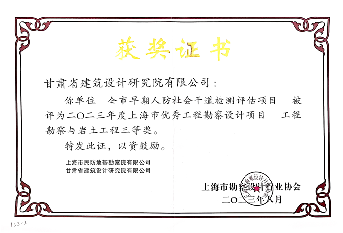 近日,上海市勘察設(shè)計(jì)行業(yè)協(xié)會(huì)公布了2023年度上海市優(yōu)秀工程勘察設(shè)計(jì)項(xiàng)目獎(jiǎng)評獎(jiǎng)結(jié)果,省建筑設(shè)計(jì)院檢測中心提交的“全市早期人防社會(huì)干道檢測評估項(xiàng)目”榮獲2023年度上海市優(yōu)秀工程勘察設(shè)計(jì)項(xiàng)目工程勘察與巖土工程三等獎(jiǎng)。