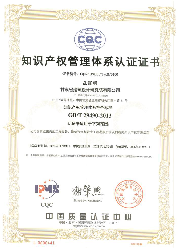 近日,省建筑設(shè)計院收到由中國質(zhì)量認(rèn)證中心頒發(fā)的編號為CQC23IPMS0171ROM/6100的《知識產(chǎn)權(quán)管理體系認(rèn)證證書》,標(biāo)志著省建筑設(shè)計院知識產(chǎn)權(quán)管理體系完全符合GB/T 29490-2013標(biāo)準(zhǔn),這是省建筑設(shè)計院在國家層面知識產(chǎn)權(quán)領(lǐng)域取得的重要認(rèn)可,進一步提升了省建筑設(shè)計院的綜合競爭力。